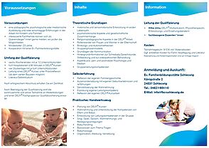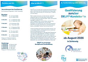 Die DELFI®-Qulifizierung in der Ev. Familienbildungsstätte Schleswig ist ein Angebot für qualifizierte Frauen und Männer, die über eine Familienbildungsstätte DELFI®-Kurse durchführen möchten. Schwerpunkt der Fortbildung ist eine Auseinandersetzung mit aktuellem Wissen und die Auswirkungen von Schwangerschaft und Geburt auf die Babys sowie die Bedeutung des ersten Lebensjahres aus pädagogischer Sicht.